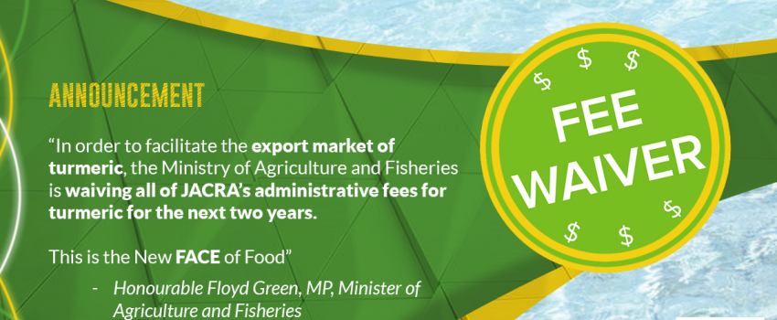 In order to facilitate the export of turmeric, the Ministry of Agriculture and Fisheries will be waiving all of the administrative fees charged for turmeric by the Jamaica Agricultural Commodities Authority over the next two years.