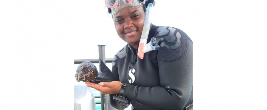 Sabrina Cain of the National Fisheries Authority poses with sea cucumber.