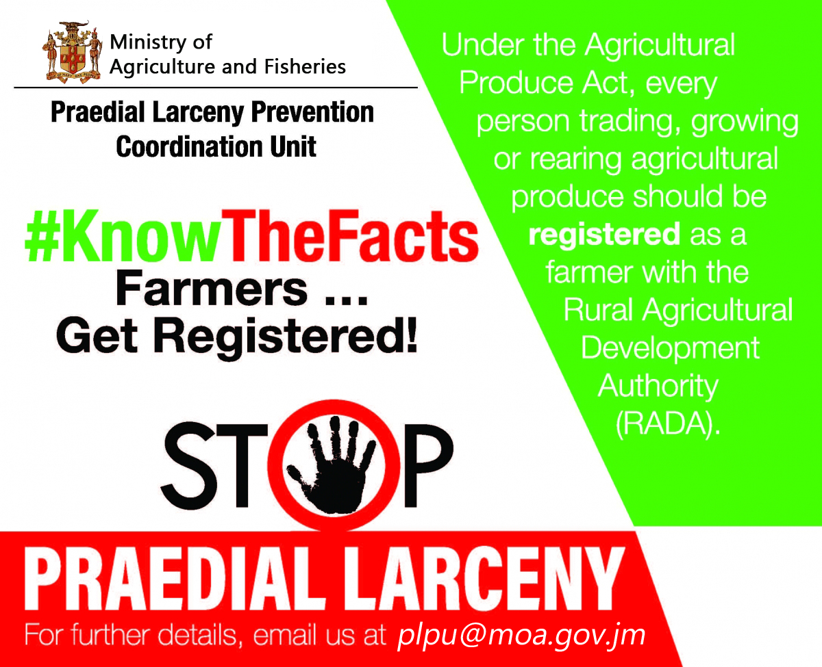 Partnering with the Ministry of National Security (MNS), Jamaica Agricultural Society (JAS), the Rural Development Authority (RADA), Ministry of Health (MOH), Crime Stop and other stakeholders, the PLPU’s main objective is to curtail praedial larceny and other farm theft across the island. With the Jamaica Constabulary Force leading the Anti-Praedial Larceny charge, the unit can mobilise members of the Jamaica Constabulary Force and civil society through farmers groups, agencies and organizations to significantly reduce the theft and illegal distribution of farm produce. Agriculture is a strategic asset to Jamaica’s development and in order to ensure the sustainability of the sector, praedial larceny must be reduced, if not eliminated.